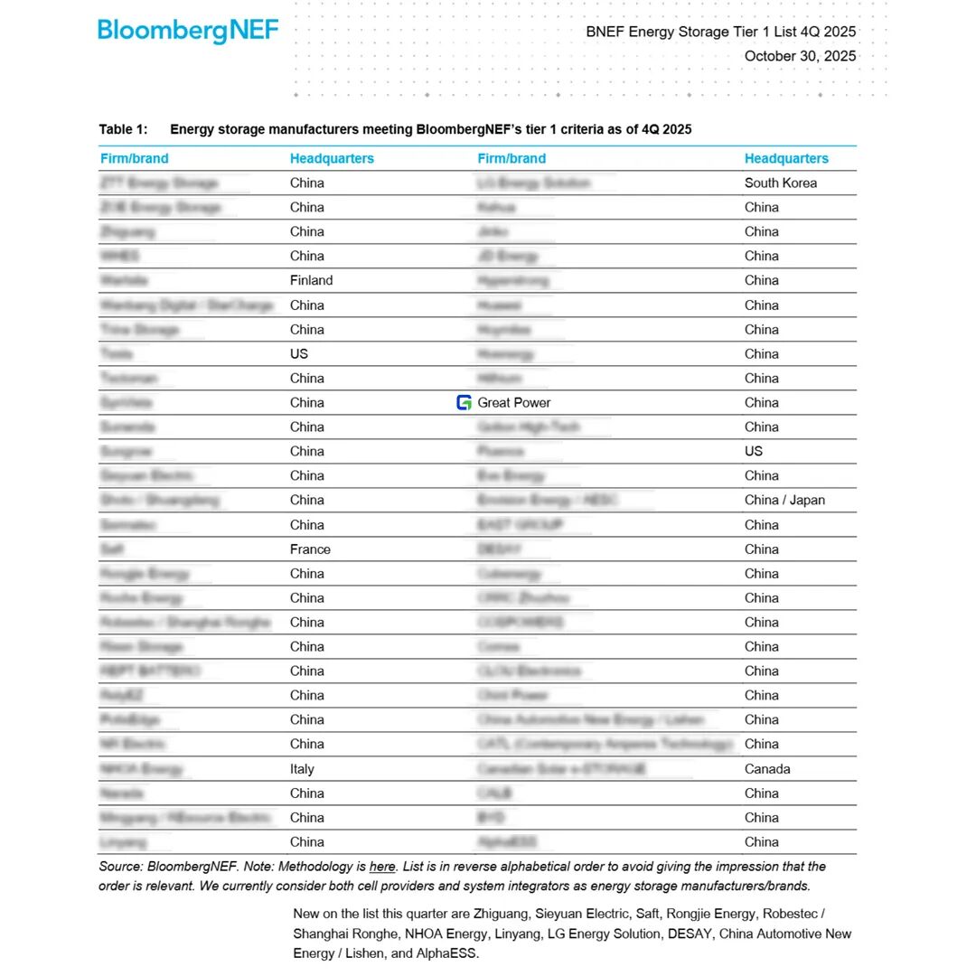 10月31日,全球权威研究机构BloombergNEF(彭博新能源财经,简称BNEF)正式发布2025年第四季度全球Tier 1一级储能厂商榜单(BNEF Energy Storage Tier 1 List 4Q 2025),鹏辉能源连续六季度荣登榜单。
