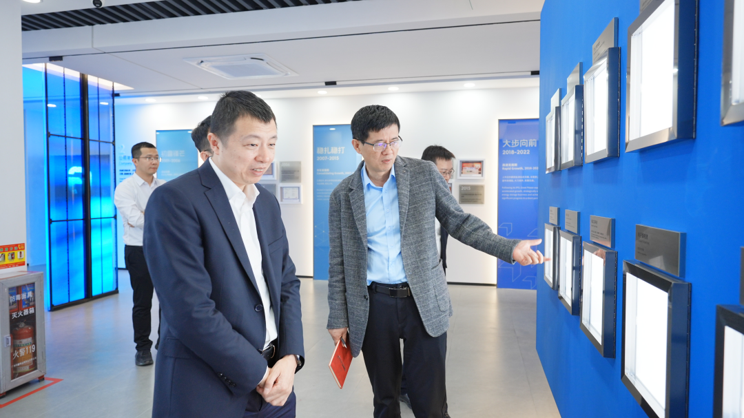 夏信德董事长正在向中车株洲所总经理、党委副书记尚敬介绍大电芯